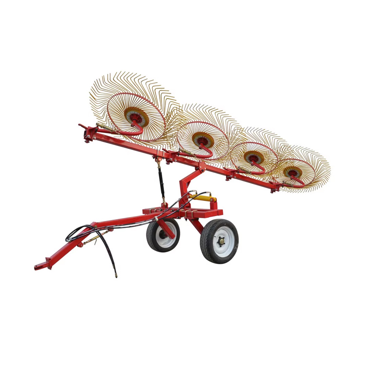 O caracteristică specială aRake cu iarbă rotativăeste că este echipat cu unul sau două rânduri de roți. Aceste roți sunt montate inteligent pe brațul roții, care se poate transforma liber pe pământ și este deosebit de flexibil. Cadrul principal și brațul roții sunt ferm conectate, iar apoi bara de remorcare a tractorului este conectată, grătarul cu roți poate rula liber pe câmp, iar operația este deosebit de convenabilă.